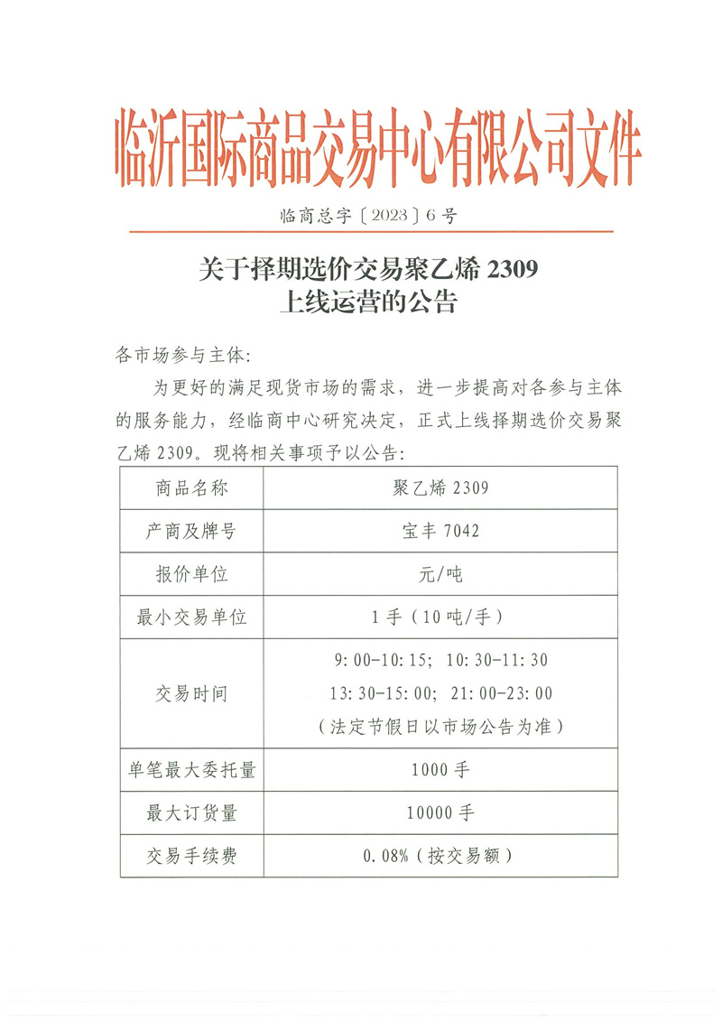 關(guān)于擇期選價交易聚乙烯 2309上線運營的公告