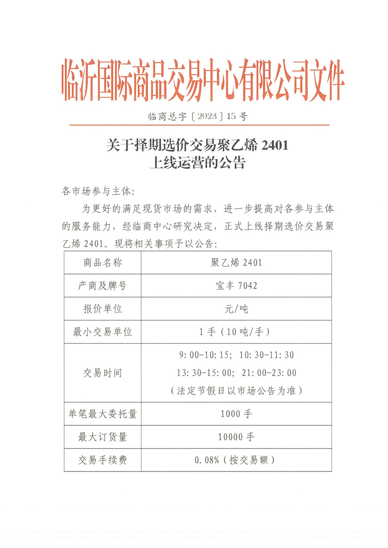 關(guān)于擇期選價(jià)交易聚乙烯 2401上線運(yùn)營(yíng)的公告