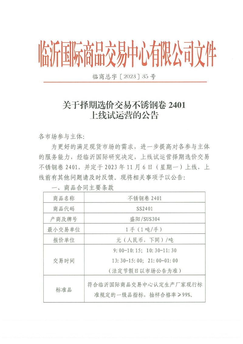 附件:臨沂國際商品交易中心有限公司擇期選價交易不銹鋼卷2311合同上線試運(yùn)營說明書.doc