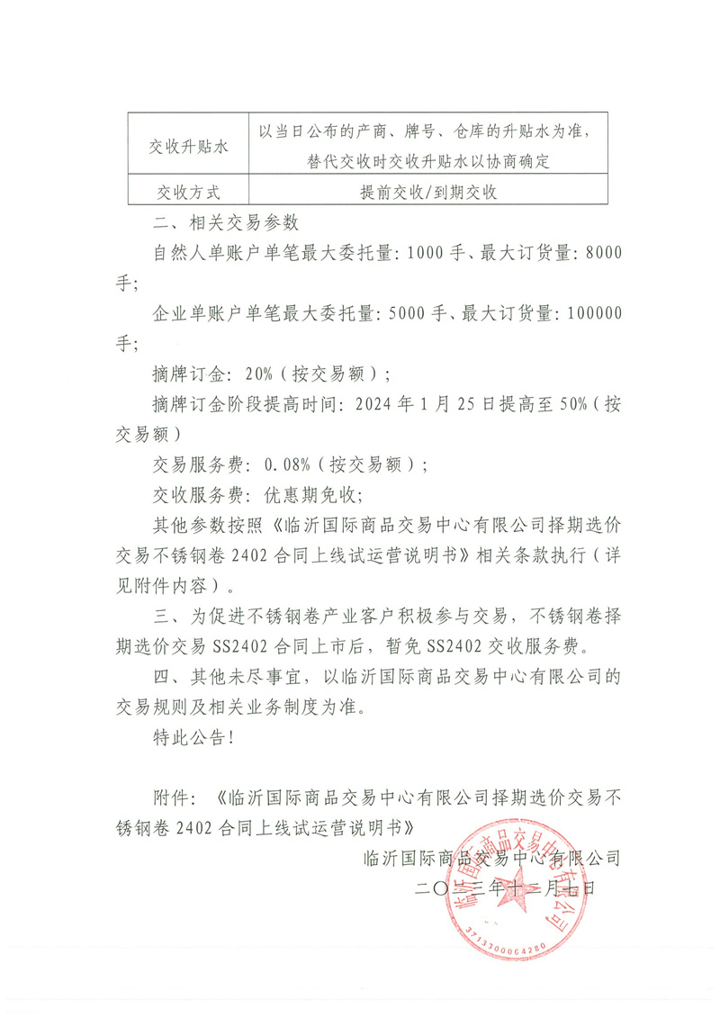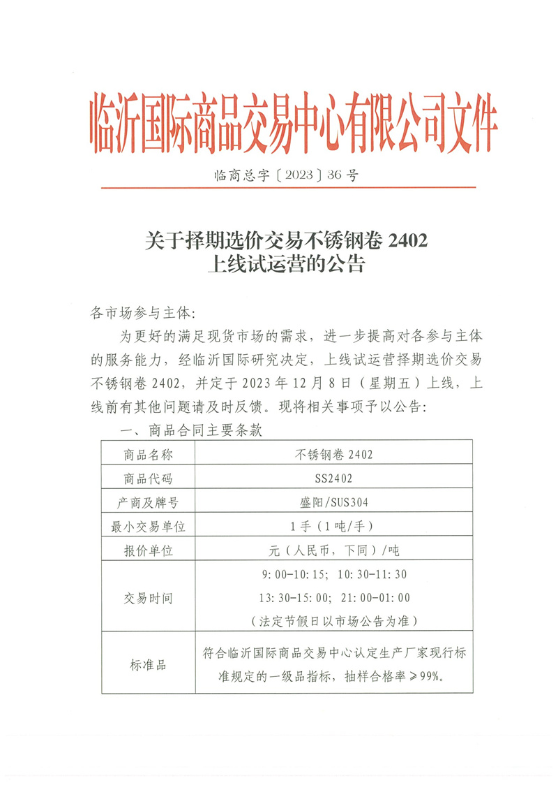 關(guān)于擇期選價(jià)交易不銹鋼卷2402上線試運(yùn)營(yíng)的公告