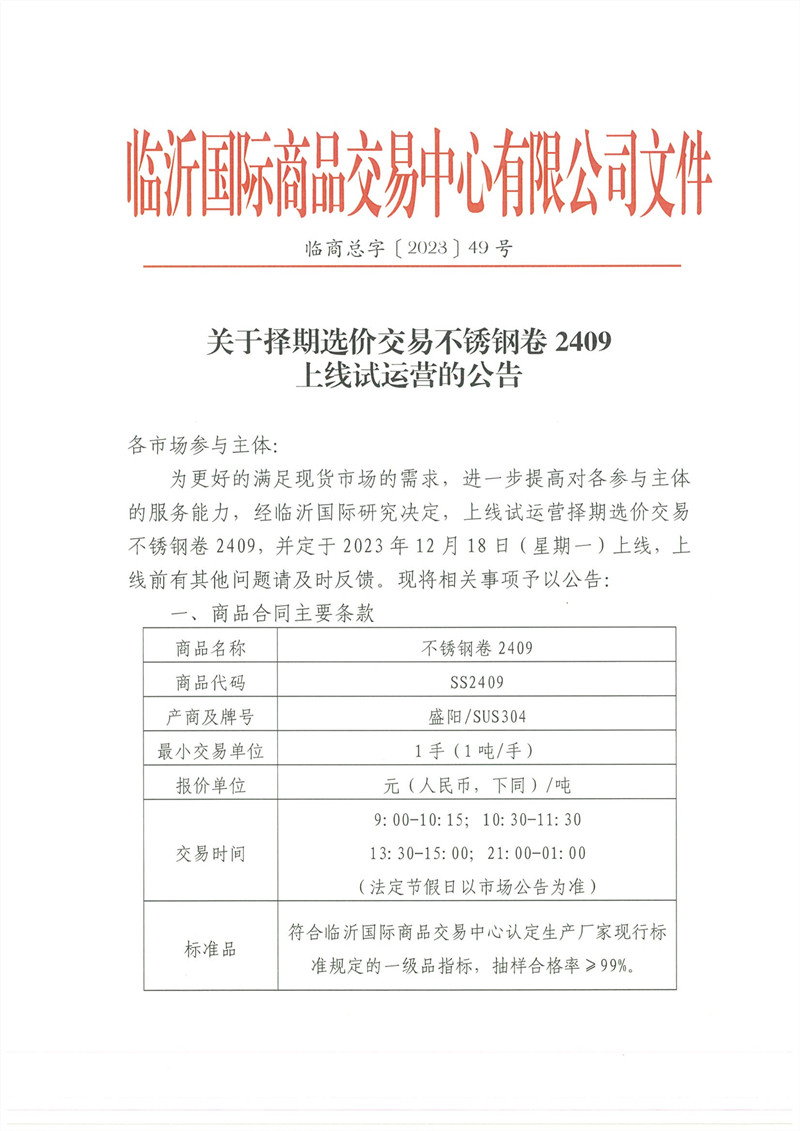 關(guān)于擇期選價(jià)交易不銹鋼卷 2409上線試運(yùn)營(yíng)的公告